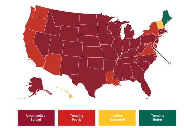 The website CovidExitStrategy.org downgraded Massachusetts from “trending poorly” to “uncontrolled spread”, its lowest rating.